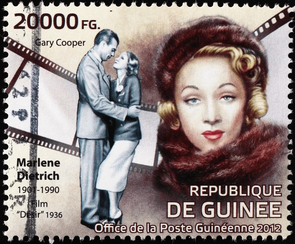 Una de las emisiones más narrativas proviene de la República de Guinea (2012), con un valor de 2000 FG. Este sello utiliza una técnica de composición visual muy interesante: muestra una imagen en blanco y negro de Marlene junto a Gary Cooper en la película Deseo (1936). Es una comedia romántica llena de sofisticación. Esta escena clásica se superpone a una imagen a color de la actriz, creando un contraste entre la nostalgia del cine clásico y la vigencia de su imagen moderna.