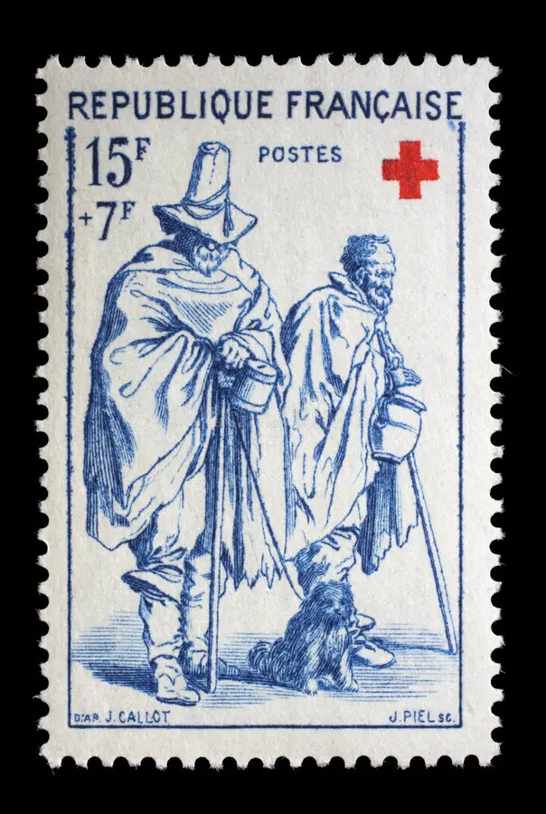 - Francia, Serie de la Cruz Roja (1957): Esta serie incluyó un sello que representaba la obra Ciego y mendigo del artista Jacques Callot, un grabado del siglo XVII conocido por su representación cruda y empática de la vida de los marginados sociales. Aunque la imagen no hace referencia directa al Braille, su inclusión en una serie de la Cruz Roja conecta la filatelia con la temática de la discapacidad visual, la pobreza y la ayuda humanitaria. Al seleccionar esta obra, el servicio postal francés y la Cruz Roja utilizaron el arte para concientizar sobre la vulnerabilidad y la necesidad de apoyo médico y social, cuyos fondos beneficiaban directamente a personas con diversas discapacidades, incluida la ceguera, demostrando el compromiso filatélico con el bienestar social.