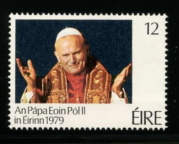 Una de las primeras visitas importantes fue a Irlanda en 1979. El sello emitido por el servicio postal irlandés fue particularmente notable por su inmediatez y claridad. Presentaba una fotografía a color de Juan Pablo II, capturando su rostro vital y enérgico de los primeros años de su papado. Esta elección de diseño, que prefería la imagen fotográfica sobre el grabado tradicional, reflejó la modernidad del pontífice y el impacto directo que su carisma causó en el mundo.