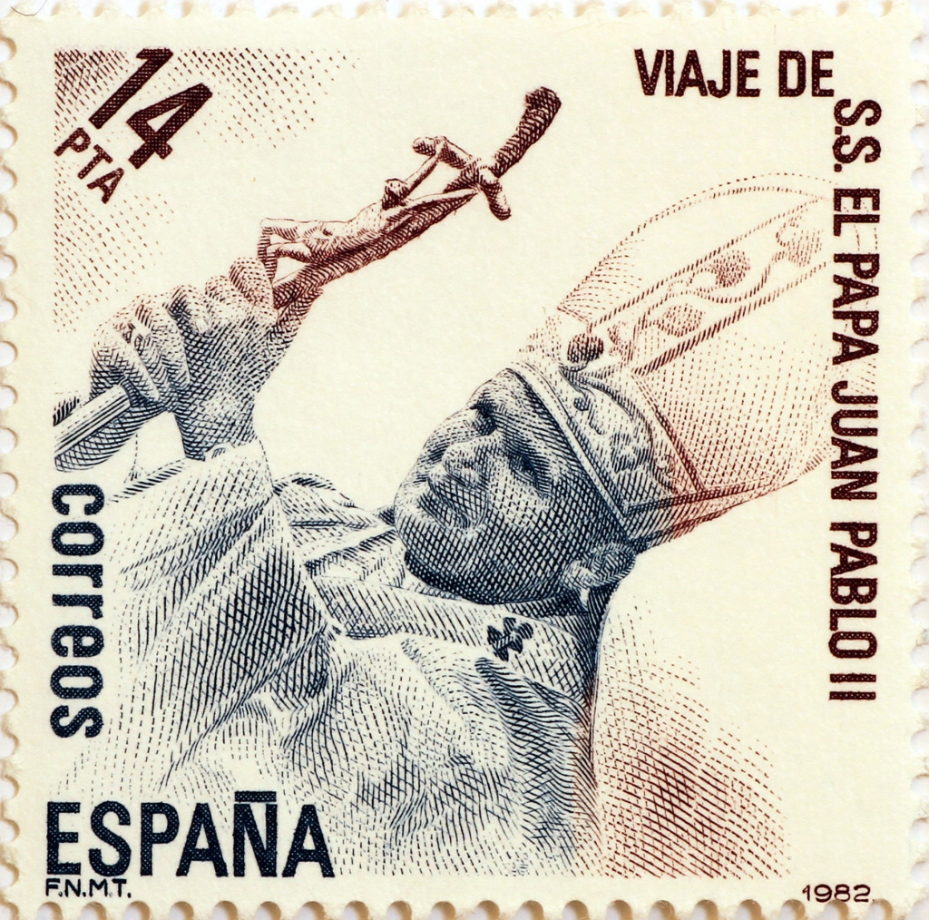 - España (1982, 14 pesetas): El sello español emitido con motivo de su primer viaje a la nación (octubre-noviembre de 1982) utilizó un hermoso grabado en dos colores (típicamente rojo y azul o similar). Este estilo de diseño, a menudo más formal y artístico, honró al pontífice y a la histórica relación entre la Santa Sede y España.