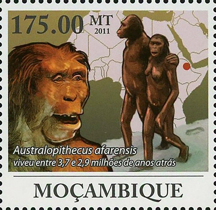 Un ejemplo vibrante es el Sello de Mozambique de 2011. Con un valor de 175 MT, esta estampilla nos ofrece una visión artística de una pareja de Australopitecus. La ilustración es clave porque humaniza a estos ancestros, mostrándolos no como simples bestias, sino como seres sociales que comenzaban a dominar la bipedestación en las sabanas africanas.