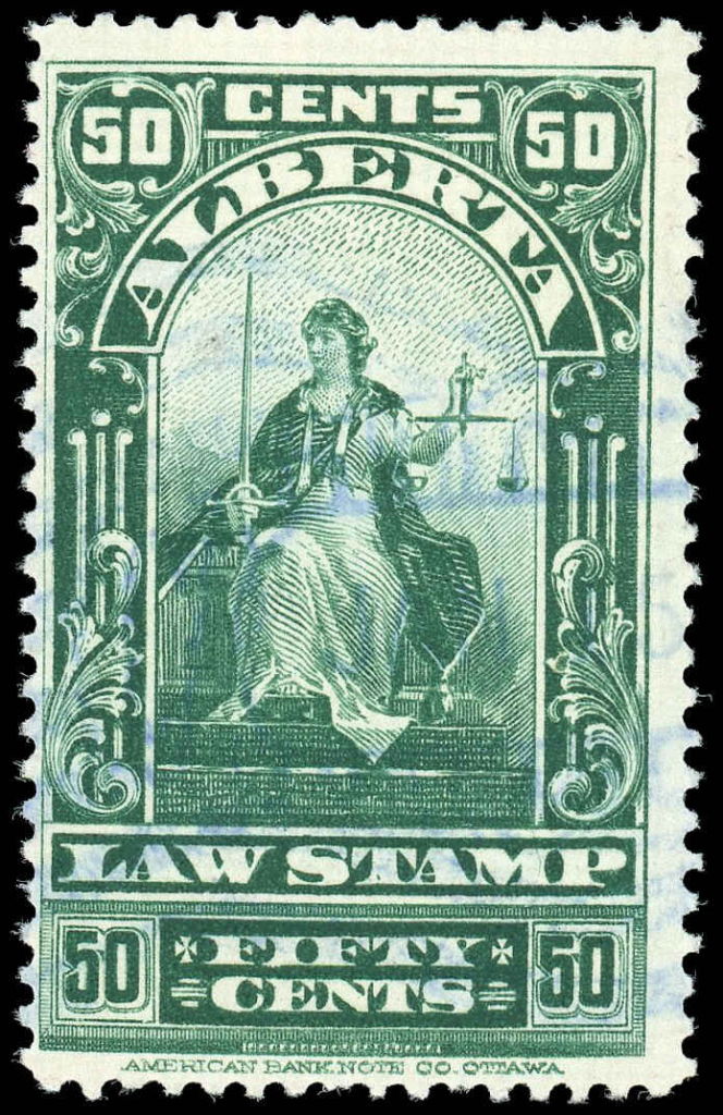 - Sello de Alberta, Canadá (50 céntimos, «Law Stamp»): Un ejemplo clásico es el sello de Alberta, que típicamente ostenta un valor de 50 céntimos y la clara inscripción «Law Stamp». Su color verde y su diseño funcional indican que su uso es estrictamente fiscal, asegurando la legalidad de un trámite judicial dentro de la provincia.