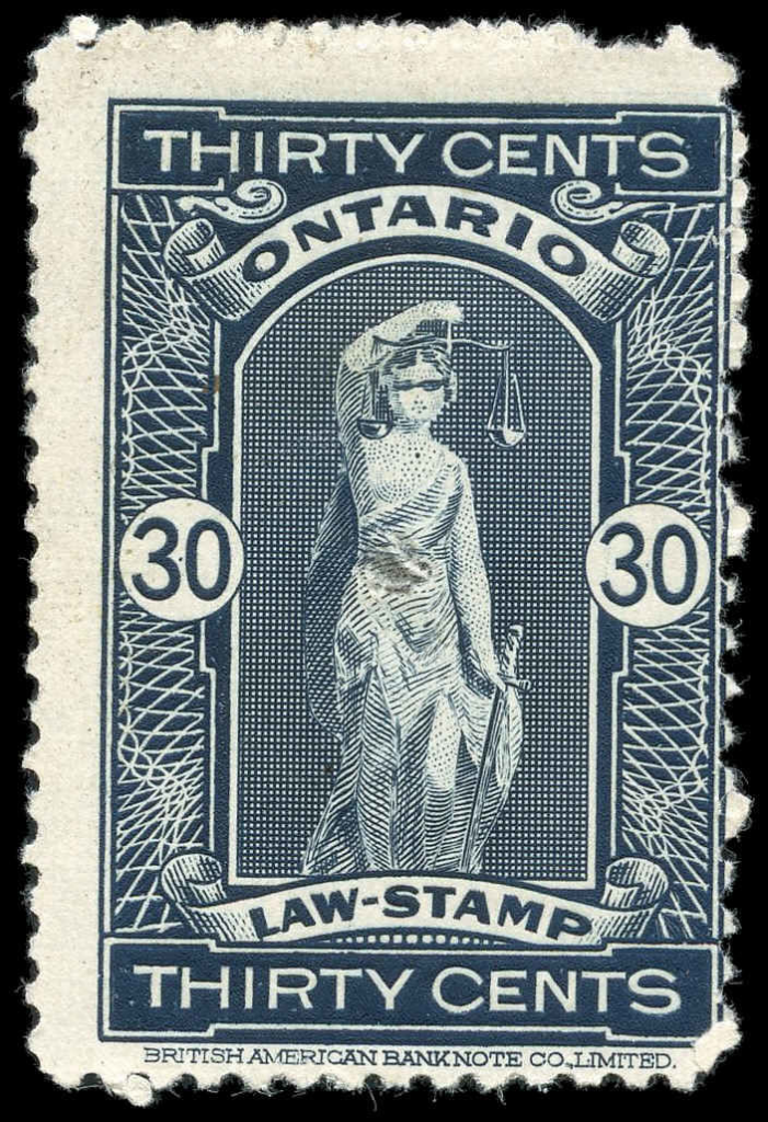 - Sello de Ontario, Canadá (30 céntimos): Otro ejemplo canadiense, el sello de 30 céntimos de Ontario, presenta un motivo más oscuro y bellamente grabado. A pesar de su calidad artística, su función es idéntica: servir como prueba de que se ha cubierto el coste requerido por la ley para determinados procedimientos. Estos sellos son valiosos para los coleccionistas de filatelia fiscal, pues documentan la historia administrativa y económica de la justicia.