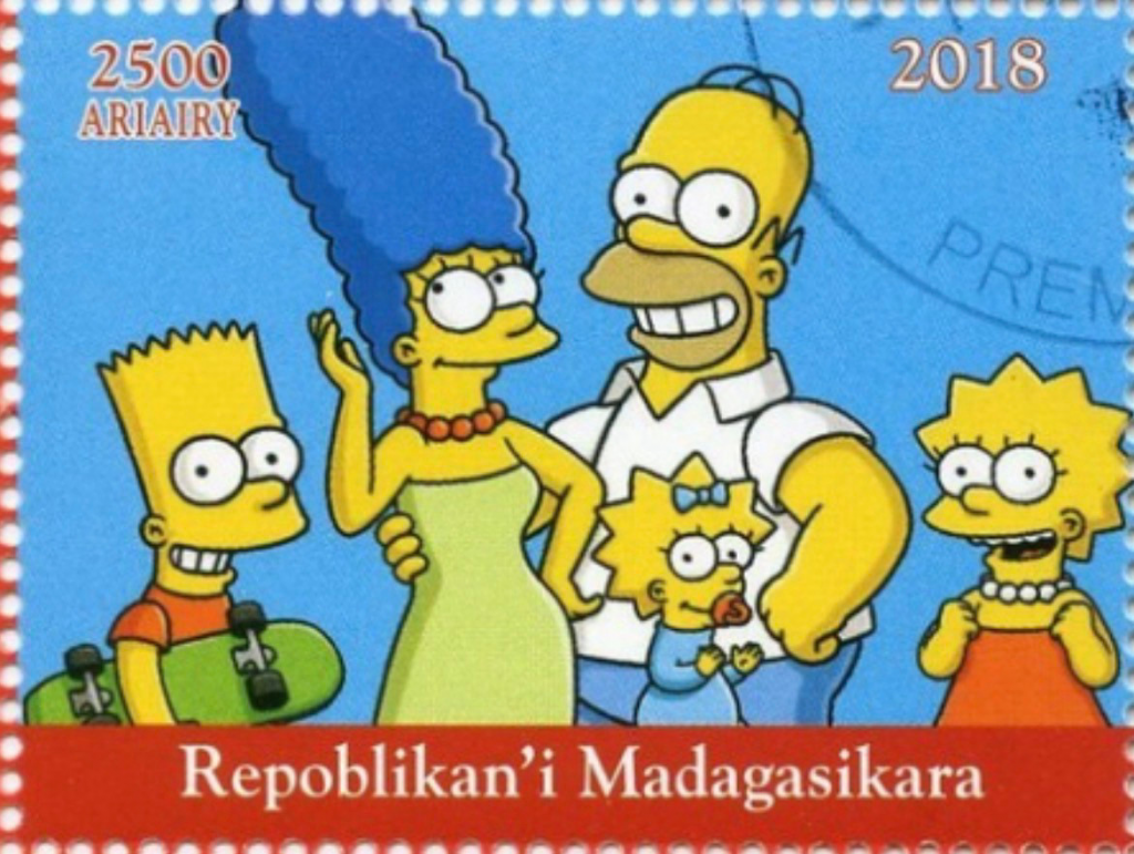 - Madagascar (2018): Un sello de 2500 ARIAIRY muestra a la familia Simpson posando sobre un fondo azul. Esta es una representación clásica que destaca a la unidad familiar en su forma más reconocible.