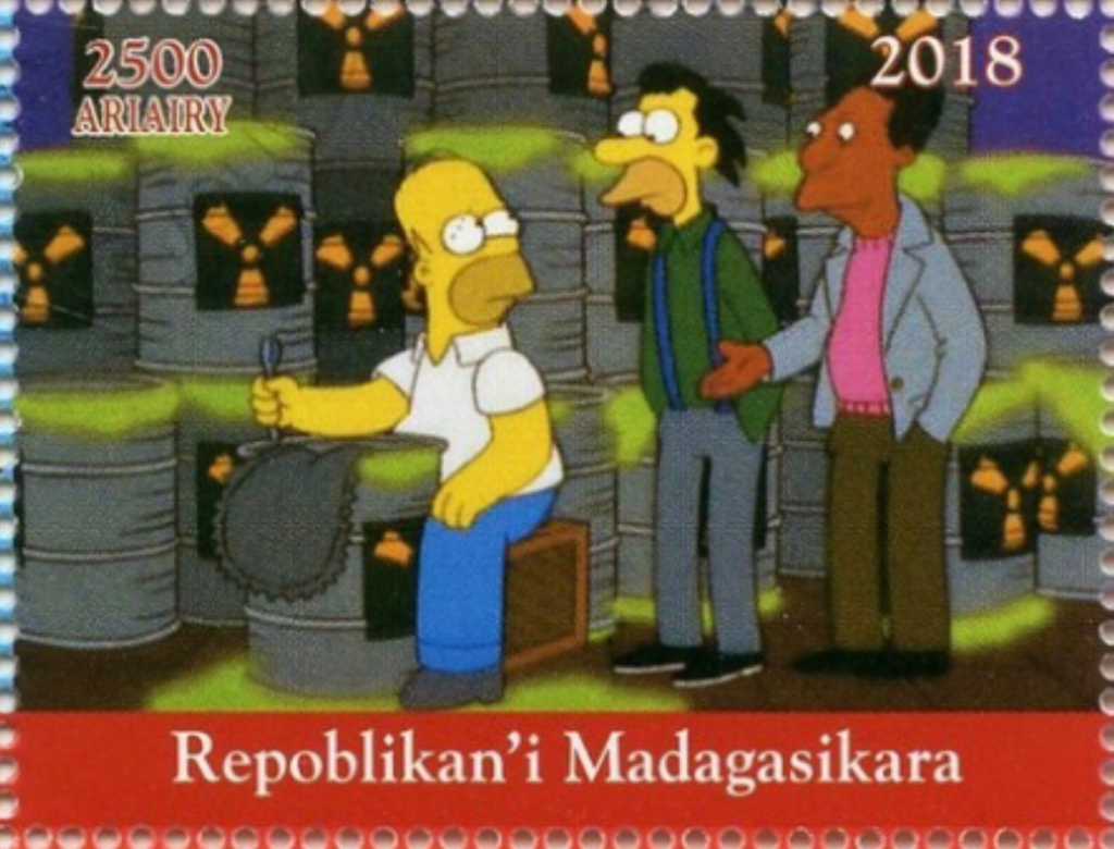 - Madagascar (2018): Otro sello con el mismo valor facial de 2500 ARIAIRY se centra en el entorno laboral de Homer, mostrando a Homer y sus colegas en la planta nuclear de Springfield. Este sello es una referencia directa a la sátira corporativa y los escenarios cotidianos que definen gran parte del humor de la serie.