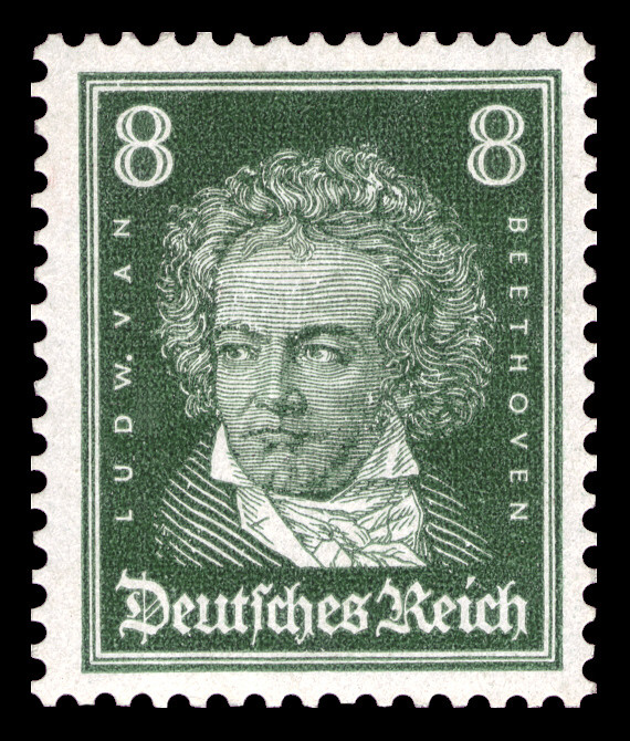 En el período de entreguerras, Alemania emitió un sello que hoy es una pieza clásica de colección. Se trata del sello del Deutsches Reich de 8 pfennig (8 pf), impreso en un sobrio color verde. Este diseño presenta un busto de Beethoven que captura su mirada intensa y su carácter decidido, reflejando el orgullo nacional por uno de sus hijos más ilustres en una época de reconstrucción cultural.